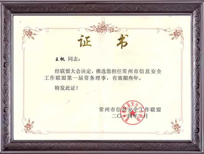 熱烈祝賀王帆總經(jīng)理成為常州市信息安全工作聯(lián)盟常務(wù)理事