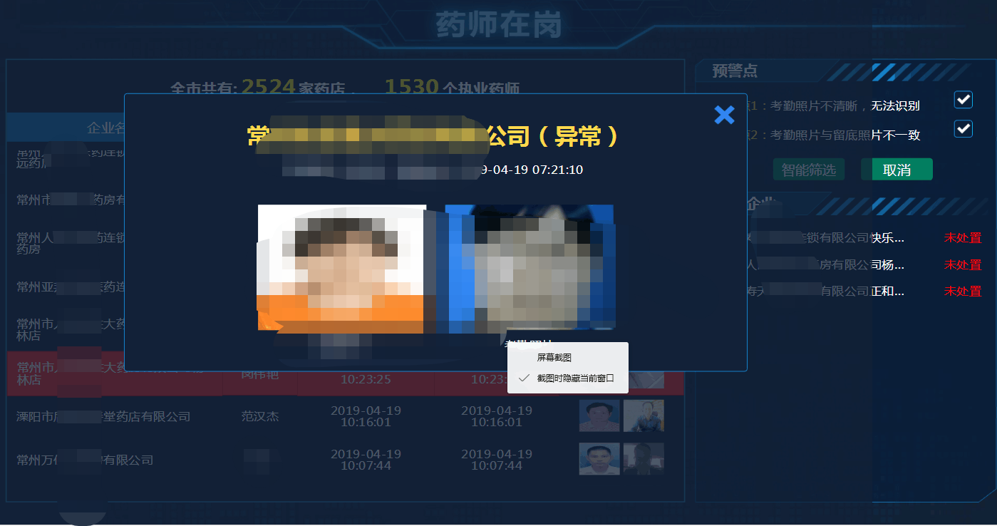 依托我司研發(fā)的智慧食藥綜合服務(wù)云平臺(tái)的藥師智能遠(yuǎn)程管理子系統(tǒng)、藥師到崗圖像智能比對(duì)預(yù)警、雙隨機(jī)智能抽查、現(xiàn)場(chǎng)移動(dòng)執(zhí)法和指揮中心遠(yuǎn)程協(xié)助等多種高新技術(shù)手段相結(jié)合,常州市市場(chǎng)監(jiān)管局匯同常州電視臺(tái)手機(jī)臺(tái),全程直播執(zhí)業(yè)藥師專項(xiàng)檢查現(xiàn)場(chǎng)、處方藥銷售情況、含麻黃堿類復(fù)方制劑銷售情況等等,實(shí)時(shí)向全市人民展示“放心藥店放心藥”落實(shí)情況,取得了極大的好評(píng)和社會(huì)效益!請(qǐng)看檢查現(xiàn)場(chǎng)直播!http://cztv.tw.live.hoge.cn/share/g5XKISTQUeZoeQgJhQ.shtml?_preview=CpaP95q_1555392659